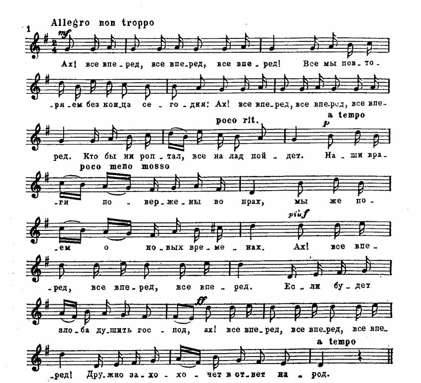 Постепенно в массовой вокальной и инструментальной музыке выработались свои типичные героические интонации. Многие из них сложились как обобщение выразительных элементов, которые характеризовали классические образы героики в операх и симфониях XVIII века.
