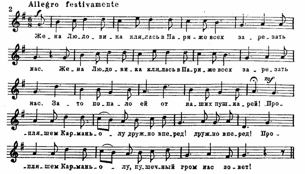 Одной из наиболее любимых революционных песен была «Карманьола». Происхождение ее неизвестно, но близость к народным источникам несомненна: