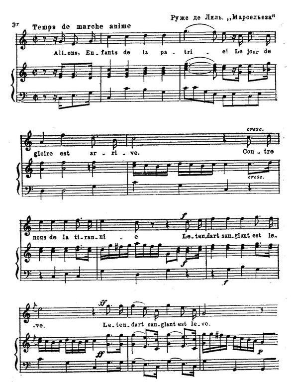Народной стала и бессмертная «Марсельеза». Ее автор, офицер действующей армии Руже де Лиль не был музыкантом-профессионалом. Он сочинил «Военную песнь Рейнской армии» 25 апреля 1792, воодушевившись известиями о победах революционной армии. Подхваченная войсками, она была принесена в Париж солдатами из Марселя (отсюда ее название - «Марсельеза») и молниеносно распространилась по всей стране. Этот пламенный республиканский гимн сыграл огромную мобилизующую роль в революционном движении многих европейских стран. «Марсельеза» - пишет Морис Торез, - грянула из недр революционной Франции в 1792 году, Франции якобинцев и жирондистов, поднявшихся против короля и феодалов. Она – выражение пламенной и страстной воли революционного народа, его порыва и героизма. Она — Революция... «Марсельеза», это мятежная песня победила Европу... Это – песня демократов и пролетариев. Она была песней декабристов Петербурга, затем рабочих Москвы и Петрограда, крестьян старой России, сбрасывавших страшное ярмо царизма и капитала и начавших великое дело построения социализма».