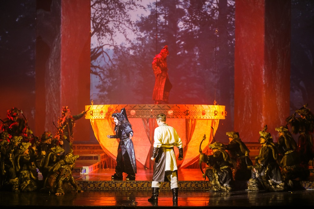 Вид современной Казани исчезает в тумане. Время стремительно откатывается назад, вглубь веков. Юноши и девушки, недавно находившиеся на берегу реки, превращаются в охотников. Обнаружив на себе охотничьи одежды, они удивлены, но с удовольствием воспринимают это переодевание, как забавное приключение. Они начинают танцевать, и их поведение напоминает поведение современной молодежи на берегу Казанки. Появляются богато одетые Ханзаде, Аксылу и Нукер. Охотники встречают их с подобающими почестями. Ханзаде спрашивает Нукера, на месте ли они. Тот объясняет, что именно здесь живет тот, кто им нужен.