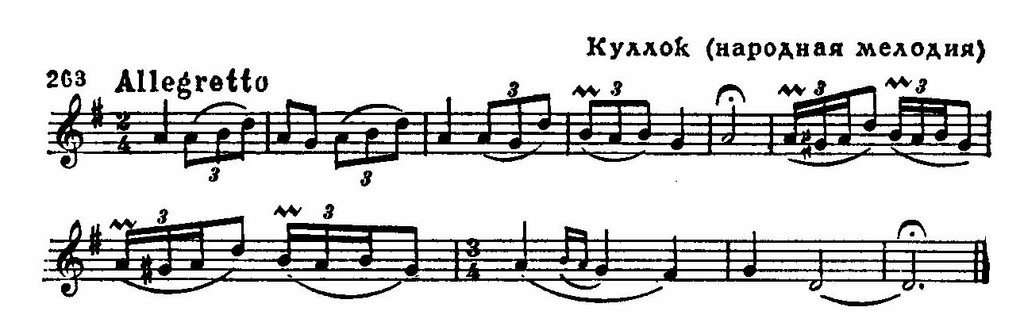 Обращает на себя внимание наличие секундовых ходов и тритоновых последований. Еще более древний слой, отражающий времена язычества, закреплен в пастушьих горных «песнях-призывах» («куллок»). Это преимущественно инструментальные наигрыши так называемого «альпийского рога», которым пастух в горах сзывает стадо. Призывное звучание пастушьих наигрышей обладает особыми, неповторимыми чертами: