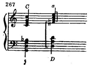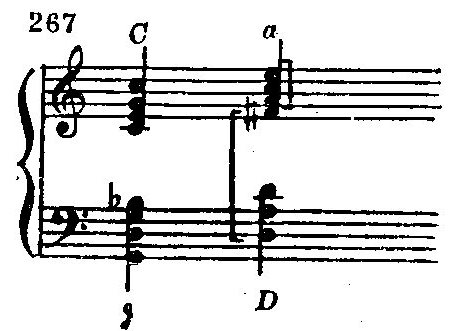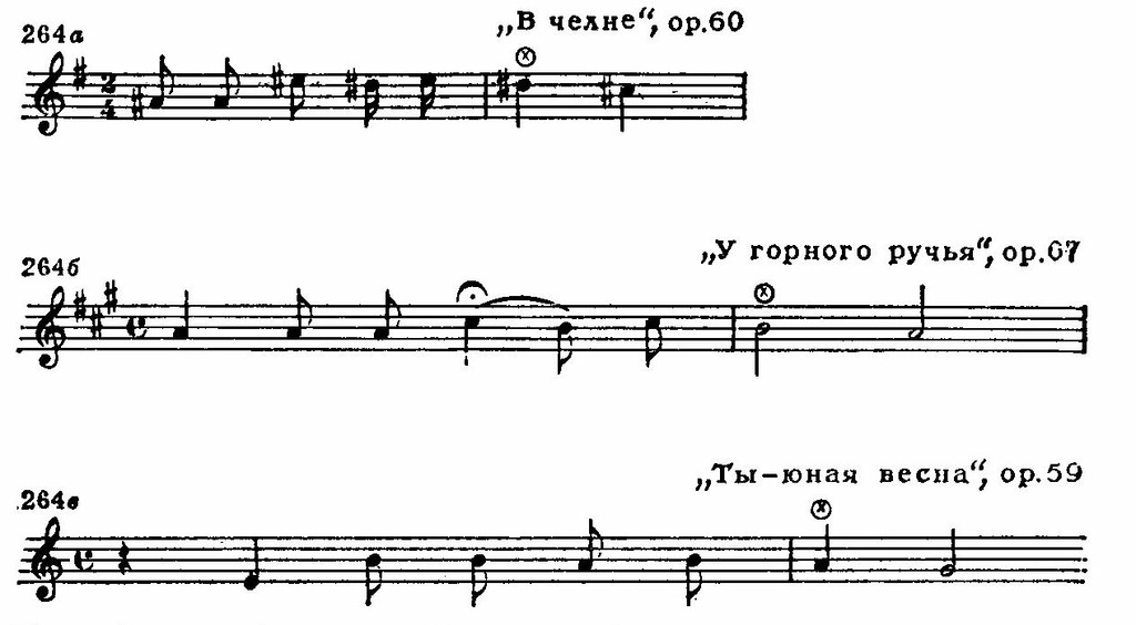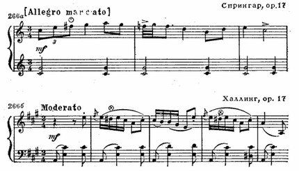 Отметим еще одну важную особенность: выше говорилось о значении тритоновых ходов — они образуются в результате повышения IV ступени. Необычайно широко и изобретательно Григ пользуется этим оборотом лидийского лада (см. примеры 265 а, б; 268 а, б, в; 279):