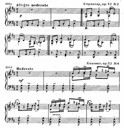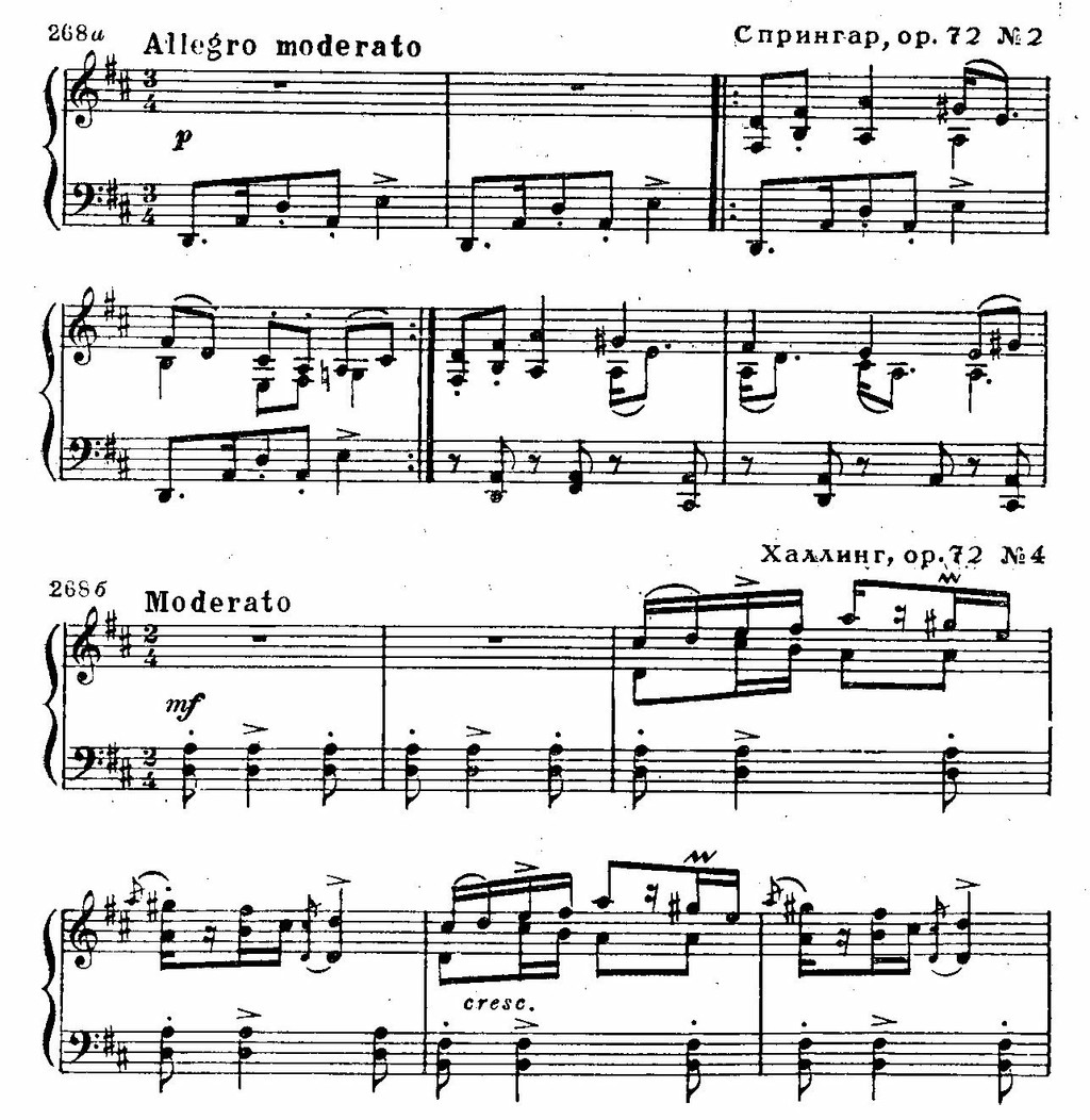В своих импровизациях народные скрипачи разрабатывали три типа танцев: «спрингар» — прыжковый парный танец нечетного размера, идущий в стремительном движении (см. пример 268 а; иногда в этом танце встречается переменный ритм: 3/4 + 2/4), «халлинг» — мужской сольный танец молодечества, четного размера, ему свойственна неожиданная смена характера движения (см. пример 268 б); «гангар» — танец-шествие в своеобразном ритме (6/8), умеренного склада, исполнялся обычно на деревенских свадьбах (см. пример 268 в):