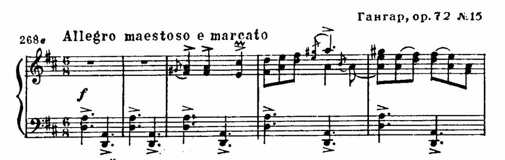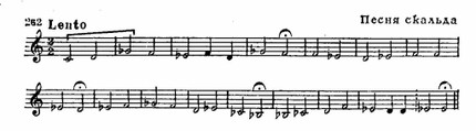 Другой излюбленный Григом оборот преимущественно встречается в плавно ниспадающих, протяжных напевах. Такие напевы связаны со светлыми думами о родине или пейзажными моментами: