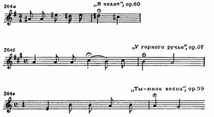 Норвежская народная мелодика отмечена рядом характерных особенностей, которые определили своеобразие музыкальной стилистики Грига. В инструментальной музыке мелодическая линия нередко развивается сложным орнаментом — в наслоении форшлагов, мордентов, трелей, мелодических задержаний или коротких призывных интонаций. Эти приемы народного скрипичного музицирования, о котором подробнее будет сказано ниже, закреплены во многих танцевальных пьесах Грига, особенно в ор. 72 (см. примеры 268 а, б, в). Но подобные приемы проникают и в вокальную музыку, где мелодические задержания служат выражению широкого вздоха. Таков, например, один из излюбленных оборотов Грига, который применяется им в моменты большого эмоционального подъема: