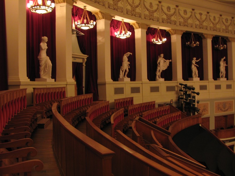 Особый архитектурный прием использован в решении верхней части интерьера большого зрительного зала — мощная галерея над амфитеатром, которая обрамляет площадь живописного плафона с хрустальной люстрой диаметром 6 метров и весом около 2-х тонн. Оригинален потолок зрительного зала — своеобразный акустический экран из прессованного картона. Пространство между колоннами верхней галереи заполнено 16 скульптурами — копиями произведений античных мастеров.
