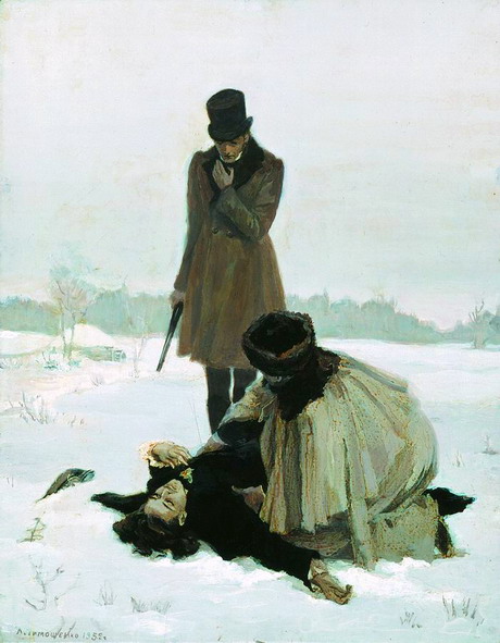 Появляется — с опозданием — Онегин вместе со своим камердинером (он же — его секундант) Гильо. Звучат формальные объяснения по поводу предстоящей дуэли. Пока секунданты готовятся к поединку, наши герои предаются размышлениям о случившемся: каждый про себя, они поют дуэт: «Враги!.. Давно ли друг от друга / Нас жажда крови отвела?» Но вот все колебания отброшены: законы чести превыше всего. Зарецкий разводит на нужное расстояние противников и подает им пистолеты. Гильо прячется за дерево. «Теперь сходитесь», — командует Зарецкий. Он три раза хлопает в ладоши. Противники делают по четыре шага вперед и начинают целиться. Онегин стреляет первым. Ленский падает. Он убит. Онегин в ужасе хватается за голову.