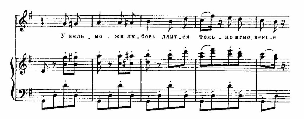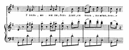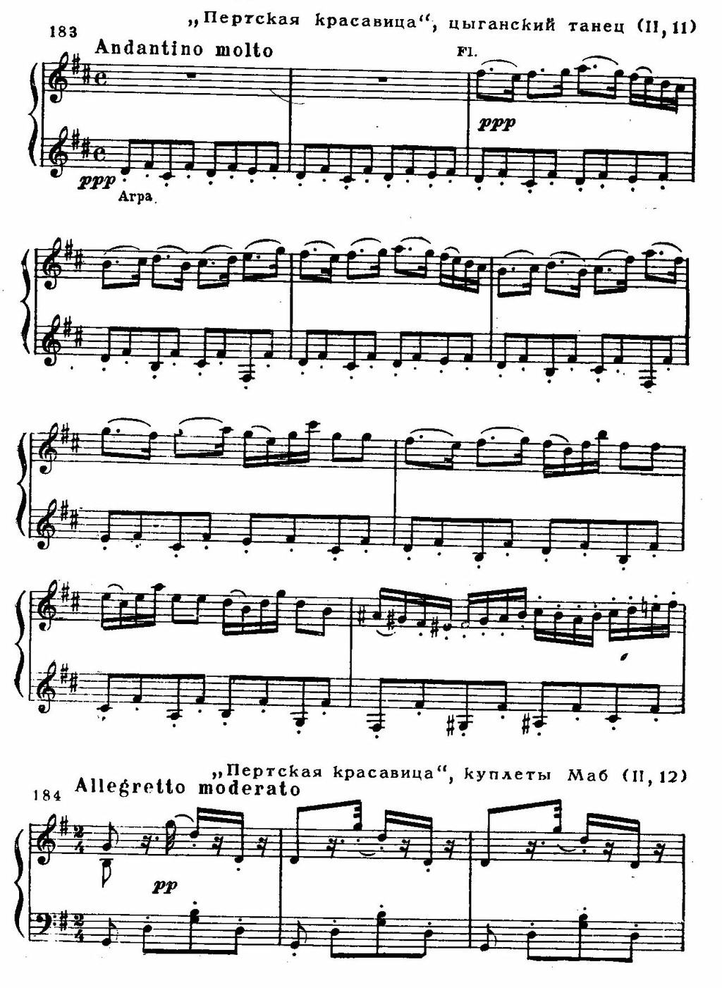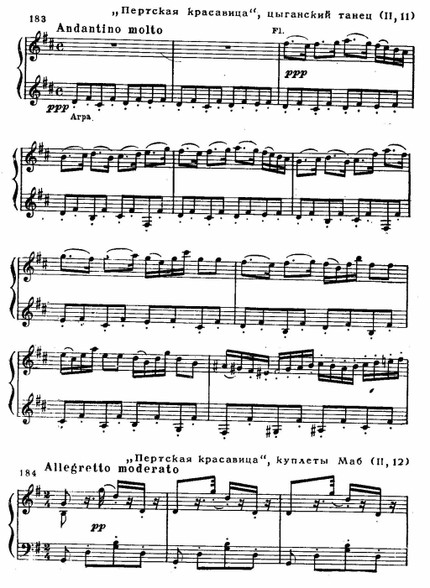 Премьера «Пертской красавицы» состоялась в 1867 году. Сюжет одноименного романа Вальтера Скотта предстал в либретто в искаженном, примитивном виде; особенно много шаблонного и трафаретного в финальном акте. «Это эффектная пьеса,— писал Бизе, работая над оперой,— но характеры мало обрисованы». Композитору не удалось дорисовать их своей музыкой. Что же привлекло его в этой пьесе? Реалистически достоверные события из жизни дочери перчаточника Гловера — красавицы Катарины, которую преследует любовными притязаниями герцог — правитель города. Противопоставление людей из народа представителям аристократии не могло не волновать демократа Бизе. Но особенно привлекала обстановка действия. Эти моменты более всего удались ему. Таковы замечательный цыганский танец с его медлительным началом, исполняемым флейтой и арфой, с последующим ускорением движения до головокружительного темпа (см. пример 183 — этот танец обычно дается в качестве вставного номера в IV акте «Кармен»); куплеты смелой цыганки Маб (см. пример 184) — они отчасти сродни хабанере Кармен; серенада Смита — жениха Катарины; оркестровая прелюдия ко II акту с примыкающим к ней хором дозорных, в целом создающие живописную картину пробуждающегося города; светлый хор в честь святого Валентина и другие.