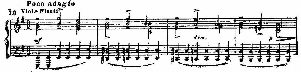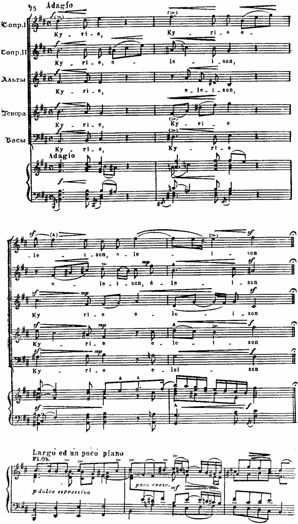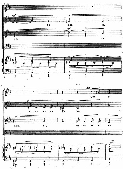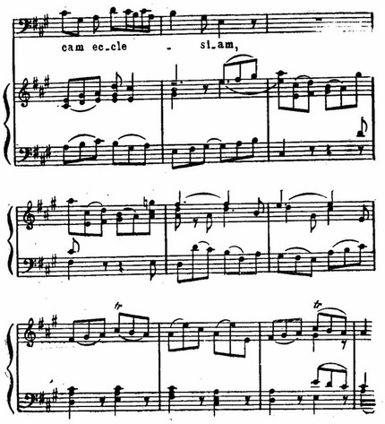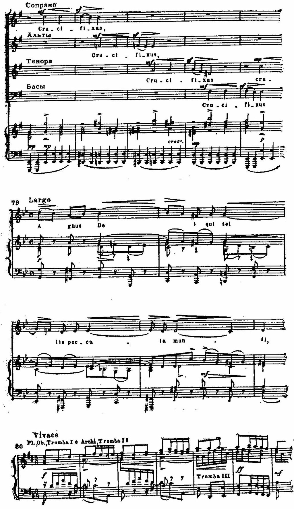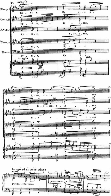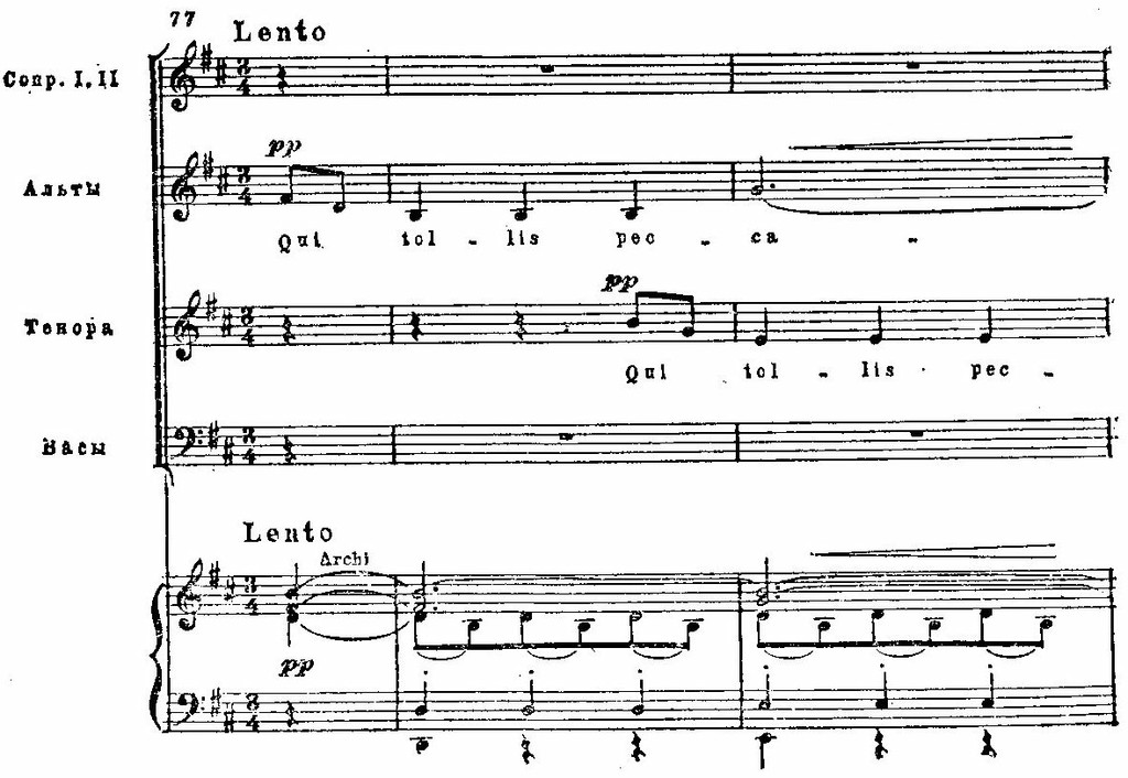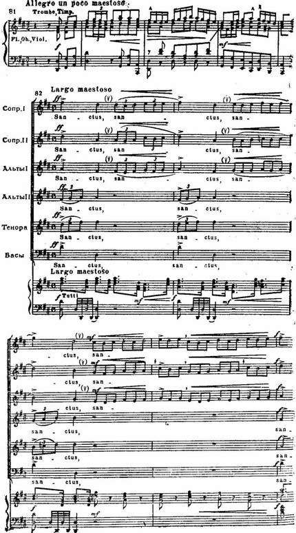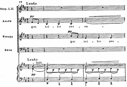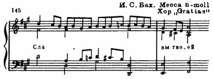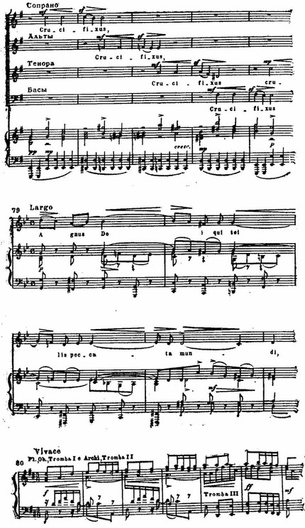 И те, и другие раскрыты во всем многообразии психологических нюансов: в трагической патетике и мрачной сосредоточенности первого и второго хоров «Kyrie eleison» (см. примеры 75, 76), в мягкой грусти «Qui tollis» («Ты, принявший на себя грехи мира») или в скорбных стенаниях «Crucifixus» (см. примеры 77, 78), в светлой печали арии «Agnus Dei» (см. пример 79); порывы радости, стремление к жизни в победных и торжественных, исполненных восторга и воодушевления хорах «Gloria», «Et ressurexit», «Sanctus» (см. примеры 74, 75, 76) или в идиллической, пасторальной арии «Et in spiritum sanctum».