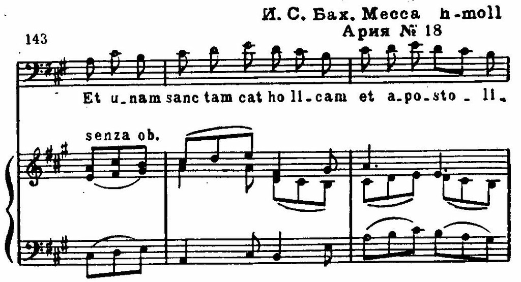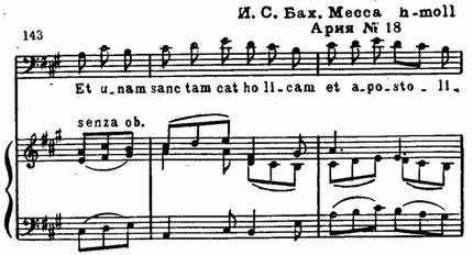 Напомним, что Бах далеко отошел от обрядовой традиции, развернув освященный церковью шестичастный цикл в монументальную композицию с двадцатью четырьмя номерами, объединенными в четырех больших частях: Kyria, Gloria, Credo, Sanctus.