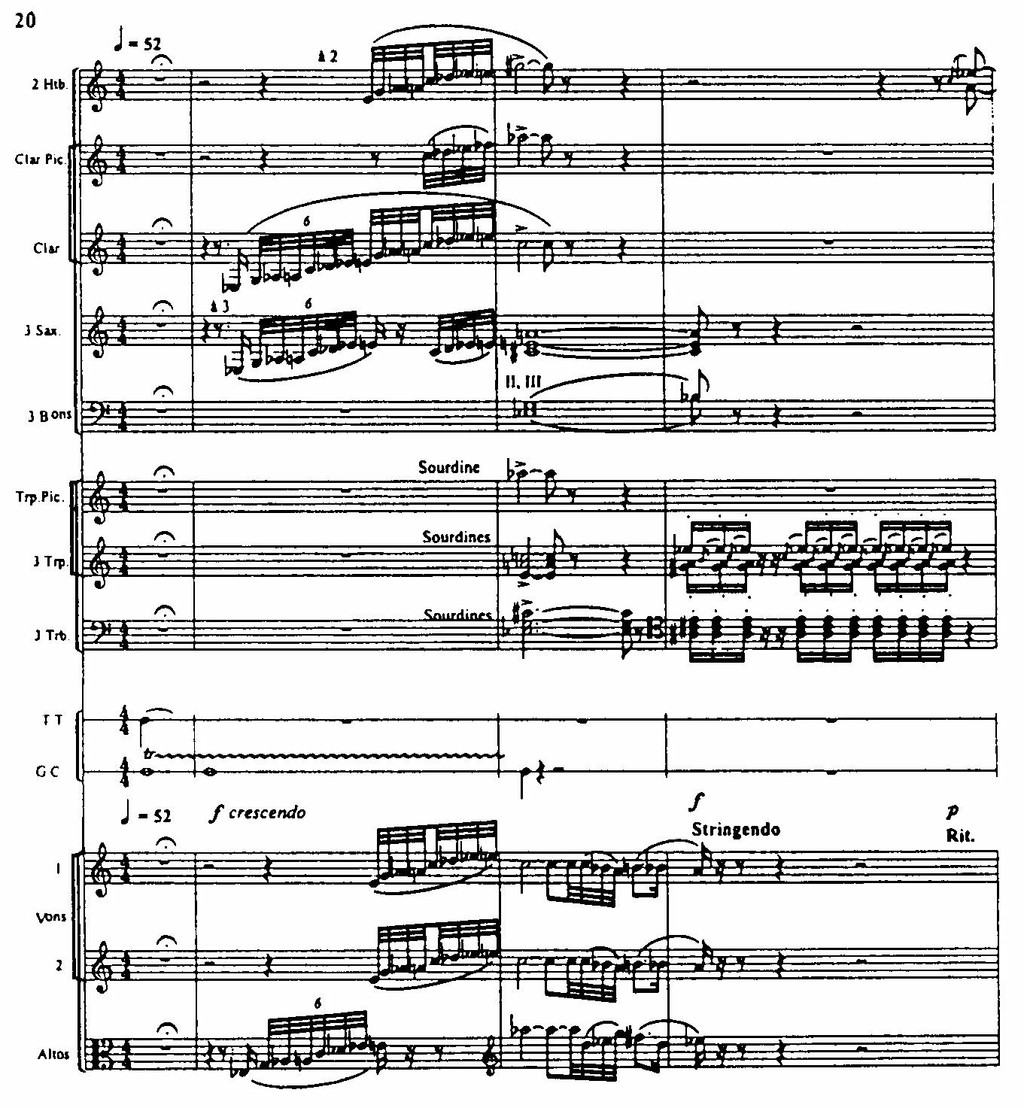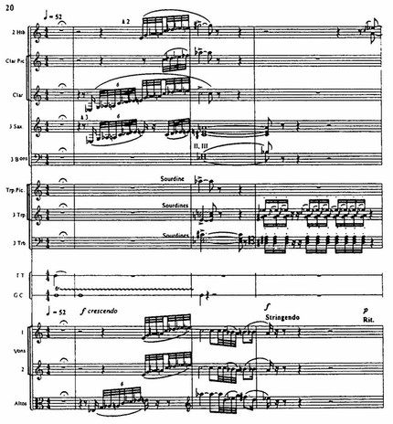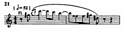 Образ героини получает разнообразное освещение в темах, связывающих ее духовный мир с окружающими, прежде всего с народом. Большое место отводится темам-символам, обладающим ассоциативной конкретностью. Таковы, например, заунывный «вой собаки» — символ страдания, физической боли (пример 20, такты 2, 3), тема смерти (пример 20, такт 4).