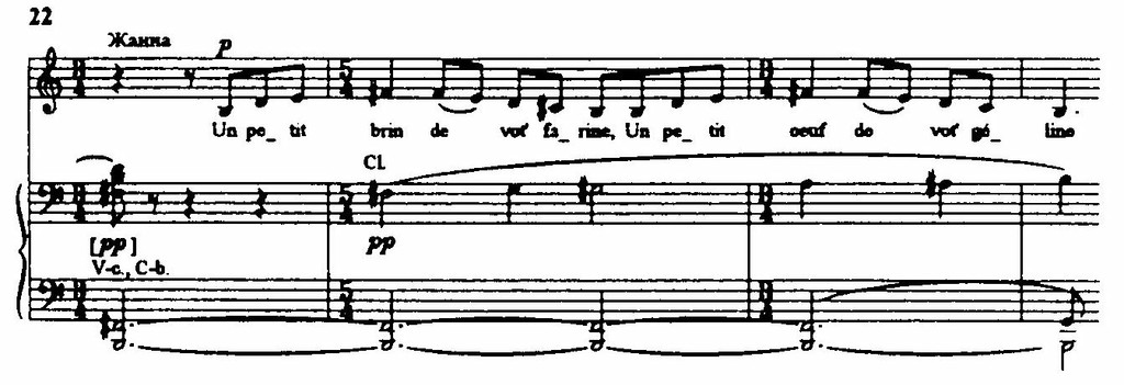 Всего десять тактов занимает песенка «Тримазо», которую вполголоса повторяет Жанна в сопровождении первых скрипок divisi.