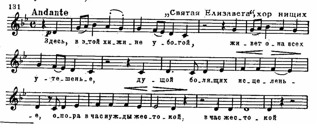 Лирический центр оратории — пятая картина «Елизавета», начинающаяся просветленной арией героини, где проходят темы первой части (Елизавета вспоминает о своем детстве). Затем следует хор нищих, построенный на теме старинной венгерской песни «Я сегодня ничего не ел» (этот хор, равно как и марш крестоносцев, высоко ценился кучкистами):