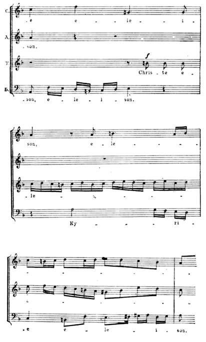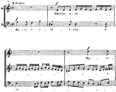 Вторая половина первой части — это двойная фуга на словах «Kyrie eleison». В этой фуге, как и в других полифонических эпизодах «Реквиема», Моцарт развивает на новой стилистической основе традиции баховской и генделевской полифонии. Обе темы фуги, контрастируя друг с другом, а потому рельефно выделяясь, звучат одновременно (вторая вступает на втором такте первой темы):