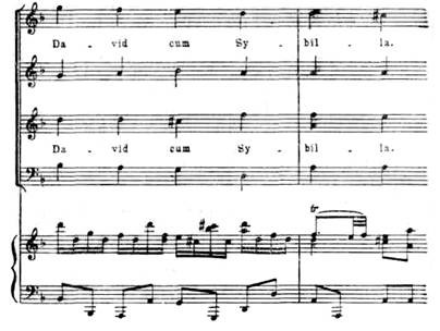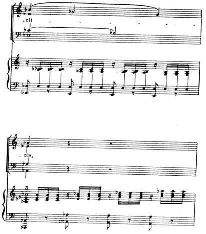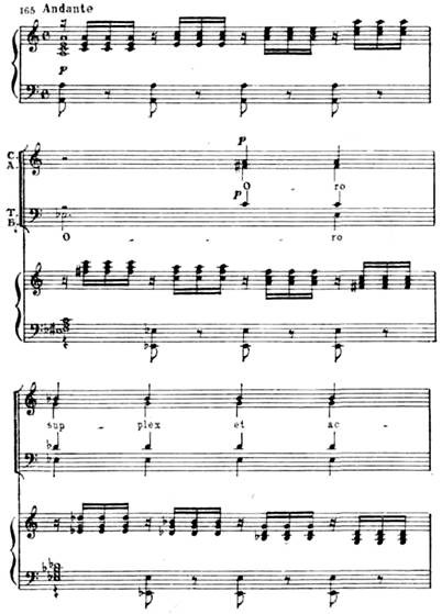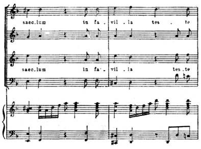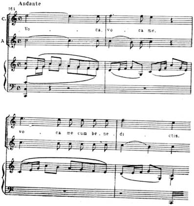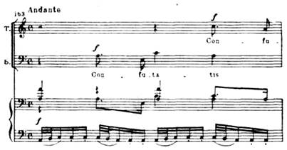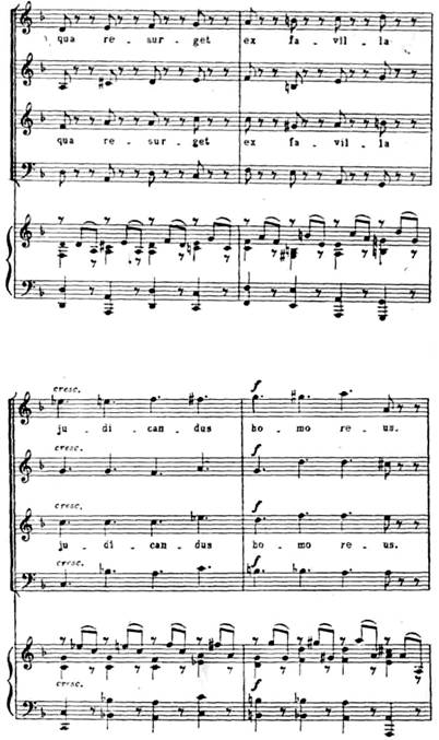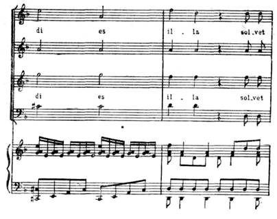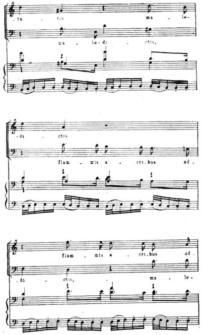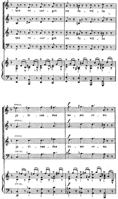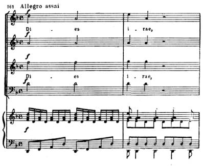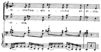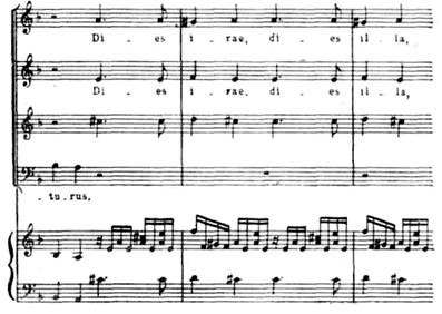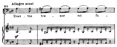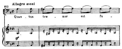 В этом примере на словах «solvet saeclum in favilla» обращает на себя внимание мелодический ход, аналогичный самому началу первой части (на словах «Requiem aeternam»). Но если в первой части это сосредоточенная скорбь, то здесь — возглас отчаяния.