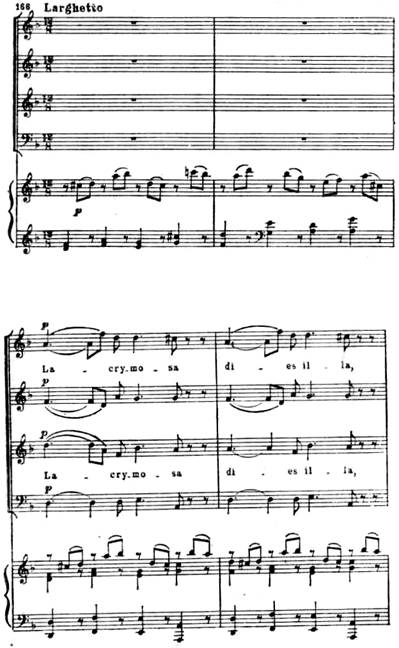 Через терцквартаккорд ре минора совершается переход к следующей части — «Lacrimosa» (No 7), этой лирической, или точнее лирико-драматической кульминации всего произведения. Фигуры скрипок передают стенания, и на этом фоне в хоре звучит полная печали минорная мелодия: