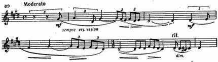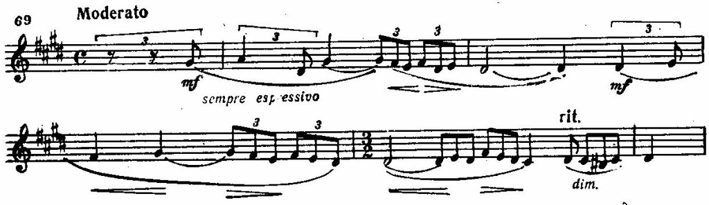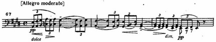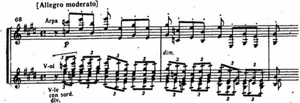 Вначале она глухо звучит у струнных басов и фагота на фоне тонического органного пункта, выдерживаемого валторнами и засурдиненными альтами тремоло, и словно отдается звонким эхом в высоком регистре у арфы и скрипок: