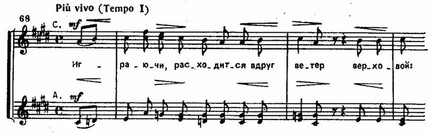 На словах «Играючи расходится вдруг ветер верховой» появляется новая тема русского народного склада с оживленным плясовым ритмом, образующая контрастный эпизод внутри первого раздела: