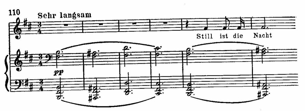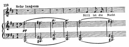 По мере того как в тексте нарастает душевное смятение, в сопровождении преодолевается, нарушается неизменная повторность и завершенность басовой фигуры. А самый драматичный момент, выражающий беспредельные страдания, передается цепью неожиданных смелых модулирующих аккордов. Совпадая с интонациями возгласа в мелодии, они создают впечатление почти бредового ужаса. Эта музыкальная кульминация приходится на точку золотого сечения: