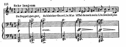 Замечательный образец преломления гейневской лирики у Шуберта – песня «Двойник». Предельно насыщенная декламационная мелодия варьирует в каждой стихотворной строке, передавая все нюансы трагического настроения. Куплетность, лежащая в основе формы «Двойника», затушевывается отчасти благодаря декламационным приемам, но главным образом вследствие своеобразия сопровождения. Краткий, скованный и мрачный мотив фортепианной партии по принципу «остинатного баса» проходит через всю музыкальную ткань романса:
