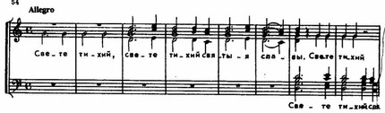 Вместе с тем композитор не ограничивается простой гармонической обработкой напевов, а создает на их основе самостоятельную, иногда достаточно сложную композицию. Одним из наиболее показательных в этом отношении примеров является гимн «Свете тихий». Звуковысотная линия мелодии, положенной в основу этого песнопения, сохраняется почти полностью, только в немногих местах Чайковский допускает небольшие отступления от оригинала. Но с помощью фактурных и гармонических средств создается вполне самостоятельная законченная композиция. Начальная фраза («Свете тихий святыя славы») звучит дважды: сначала в женской, затем мужской группе, благодаря чему возникает красочный тембровый контраст, оттеняющий первые слова текста.