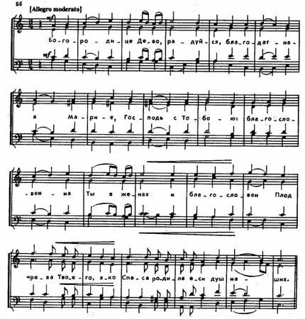 Примером более свободного отношения к заимствованному напеву может служить тропарь «Богородице Дево, радуйся», в основу которого положена мелодия греческого роспева. В первой половине этого песнопения композитор точно воспроизводит мелодическую линию подлинника, за исключением небольших изменений в конце (на словах: «Марие, Господь с тобою»), не нарушающих общей направленности звуковысотного движения. Во второй же части он сохраняет только некоторые отдельные обороты, существенно изменяя общий рисунок мелодии и ее основные ладовые опоры. В результате возникает симметричная двухчастная форма с половинной каденцией в середине и полной автентической в конце.
