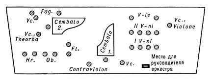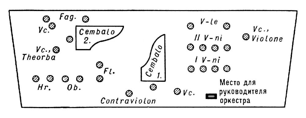 В глубине (справа) могли размещаться трубы и литавры. В концертном составе на первом плане около капельмейстера находились солисты, что способствовало равновесию звучности. Специфика подобной рассадки заключалась в функциональном объединении инструментов, образующих несколько пространственно разделённых звуковых комплексов: 2 группы continuo, группа concertino в концерте, иногда и в опере, 2 большие контрастные группы (струнные, деревянные) вокруг 2 чембало. Такая структура требовала многоступенного управления. Часть исполнителей следовала за аккомпанирующим чембало, О. в целом — за чембало капельмейстера. Широкое применение получил также способ двойного управления (см. Дирижирование).