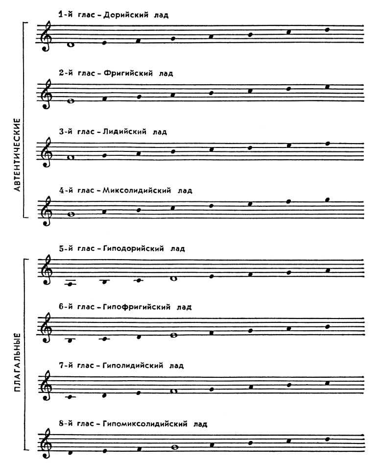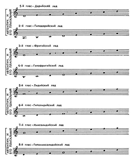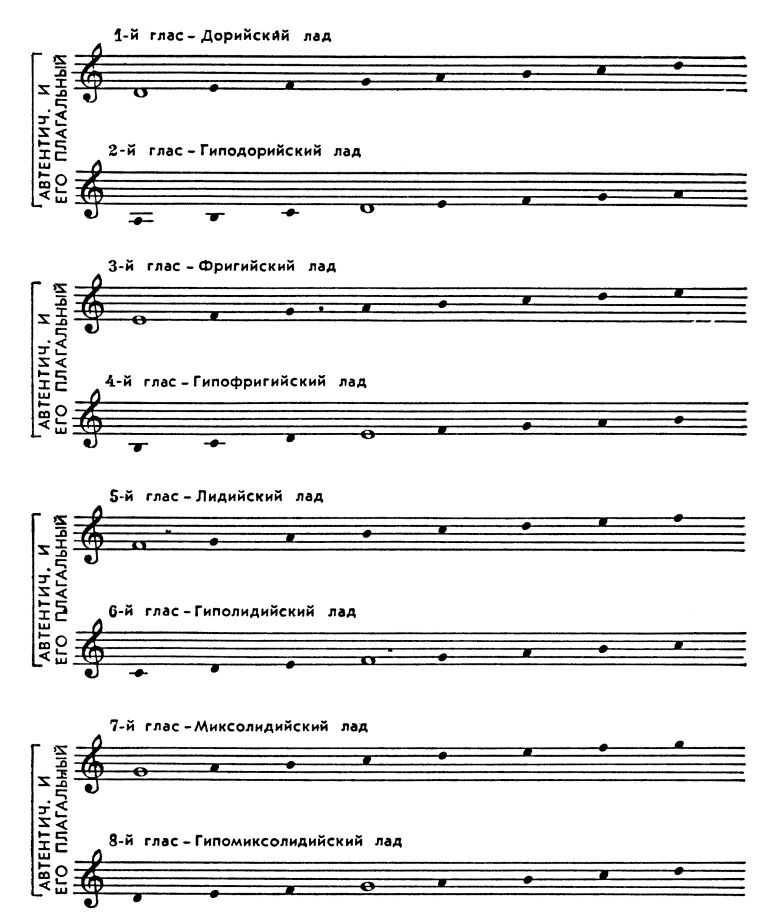 Исходя из существования неск. диатонич. разновидностей октавного звукоряда, они отнесли к 1-му гласу последовательность d-е-f-g-а-h-с-d, ко 2-му — e-f-g-a-h-с-d-е, к 3-му — f-g-a-h-с-d-e-f и к 4-му — g-a-h-с-d-e-f-g. 1-й звукоряд был назван дорийским, 2-й — фригийским, 3-й — лидийским и 4-й — миксолидийским. От этих гласов как от основных (автентических) производили 4 косвенных (плагальных); тоника автентического оказывалась в середине плагального (IV ст.), сохраняя при этом своё первоначальное значение.