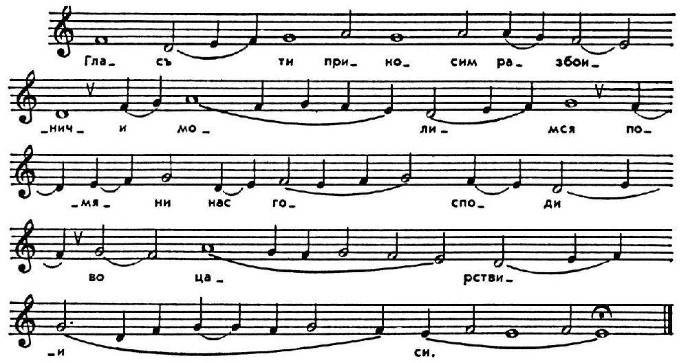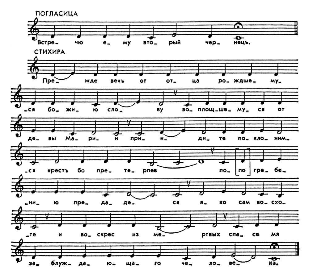 В 1-м примере приведены минорная погласица и образец для пения псалмов на глас. Во 2-м — мажорная погласица и стихира, распетая на основе погласицы. 3-й пример — подобен, т. е. образец для пения текстов, не положенных на музыку.