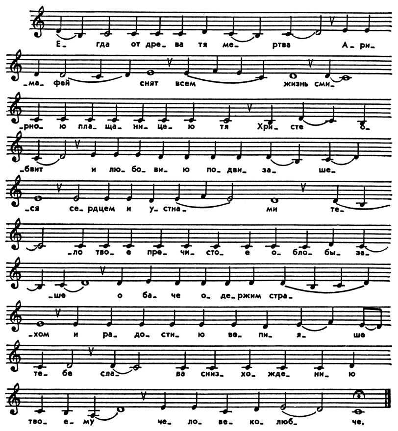 Метод композиции построчный: текст членится на строки и каждая оформляется как законченная мелодич. фраза (отмечены знаком v).