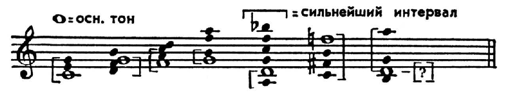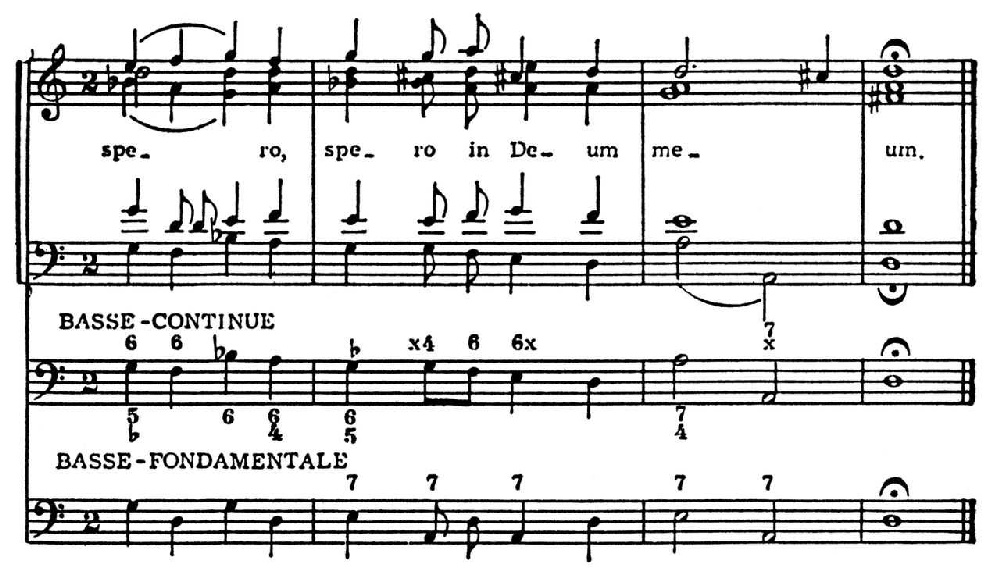 Фундаментальный бас явился первым науч. обоснованием гармонич. тональности. В определении О. т. аккорда типа f-а-с-d в C-dur Рамо выдвинул теорию «двойного применения» (double emploi): если аккорд переходит далее в g-g-h-d, его О. т. — звук d, если в с-g-с-е, то f. Ступенная теория гармонии (Г. Й. Фоглер, 1800; Г. Вебер, 1817; П. И. Чайковский, 1872; Н. А. Римский-Корсаков, 1884–85; Г. Шенкер, 1906, и др.) абсолютизирует терцовый принцип построения аккордов и принимает за О. т. нижний звук аккорда, сведённого к осн. виду — ряду терций; на каждом звуке гаммы как осн. тоне строятся трезвучия и септаккорды (а также нонаккорды). В функциональной теории X. Римана проводится различие между О. т. и примой аккорда (в мажорном аккорде то и другое совпадает, в минорном нет; напр., в а-с-е О. т. — звук, а, но прима — е). П. Хиндемит выдвинул новую теорию О. т., к-рый определяется по гармонически наиболее сильному и наиболее определённому для восприятия интервалу (напр., если в аккорде есть квинта, её О. т. становится О. т. всего аккорда; если квинты нет, но есть кварта, функцию общего О. т. выполняет её О. т. и т. д.). Теория О. т. Хиндемита позволяет анализировать и созвучия совр. музыки, недоступные для прежней теории и поэтому даже не считавшиеся аккордами: