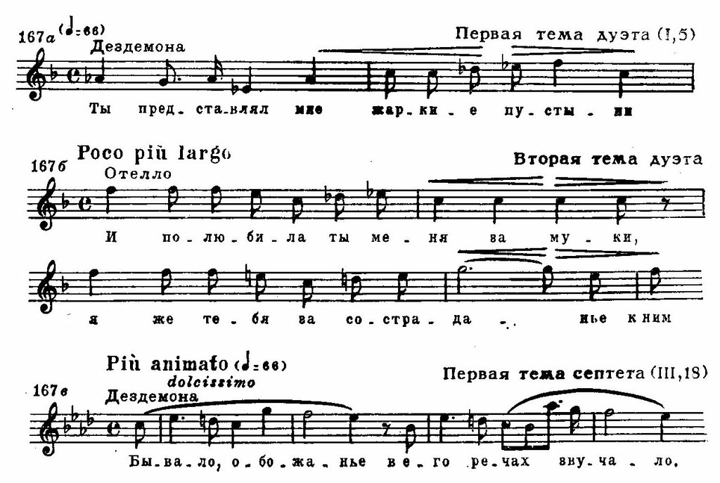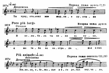 I акт делится на три большие сцены; условно назовем их «Буря», «Таверна», «Ночь». Каждая из них имеет свои музыкально-драматургические центры, в которых закреплено развитие действия и характеров. Опера начинается без увертюры, ее заменяет большая динамическая хоровая сцена; она одновременно является косвенной характеристикой Отелло — народного любимца и вождя. Во второй сцене развертывается интрига и дана первоначальная экспозиция образа Яго с его замечательной застольной песней. Третья сцена — любовный дуэт, в котором обрисованы поэтичный облик Дездемоны и лирические стороны характера Отелло (две основные темы дуэта см. в примерах 167 а, б). Конец акта — высшая светлая точка трагедии — запечатлен в изумительной по красоте любовной теме: