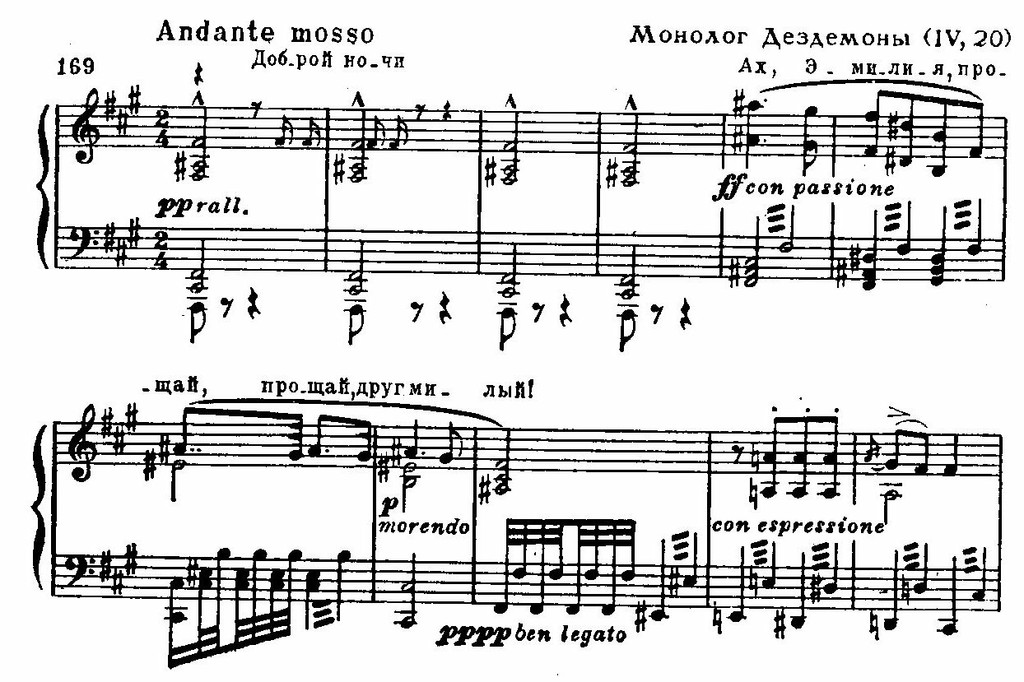 Тематизм вступления пронизывает всю первую сцену акта с песней об иве и молитвой Дездемоны — этими выдающимися примерами народно-песенной лирики Верди. Отзвуки данного тематизма проникают и в интонации Отелло, прозревшего после гибели Дездемоны. В момент его смерти возникает чудесная мелодия любви из дуэта I акта (см. пример 165): так композитор средствами музыки закрепляет в памяти слушателей благородный и мужественный, глубоко человечный образ несчастного мавра.