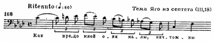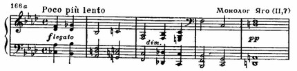 Яго, напротив, хитрый и коварный, способный на скороговорку, на устройство пышных, развращающих вакханалий (в разнузданно-цветистом стиле), торжествует благодаря высокопарным вокальным излияниям, усыпляющим чужую совесть («Credo»).