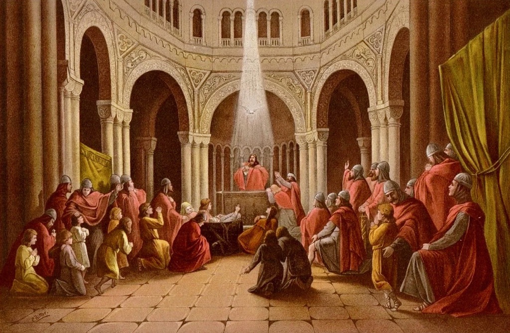 Сцена 2. Величественный зал Грааля. Амфортасу помогают взойти на трон. Боль от его раны столь велика, что он не в силах снять покрывало с Грааля, и, будучи не в состоянии больше выносить эти страдания, он молит лишь об одном — о смерти. Но вперед выступает Парсифаль. Он обращается к Амфортасу со словами: «В одно оружие верь! Ты ранен им, оно лишь и спасет!» — и он касается священным Копьем его раны. Амфортас тут же излечивается. Парсифаль провозглашает себя королем Грааля. Он освобождает Грааль от покрывала, и, когда он преклоняет колени в молчаливой молитве, чаша излучает необычайное свечение. Голоса рыцарей, а также хор мальчиков возносятся в чудесных гармониях. Кундри при этих звуках, устремив на священный сосуд свой последний взгляд, падает замертво: в смерти обрела она покой и прощение грехов. И когда Парсифаль держит священный сосуд над головами рыцарей, оркестр играет заключительные такты оперы — преображенные темы Грааля и тайной вечери.