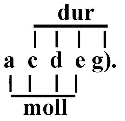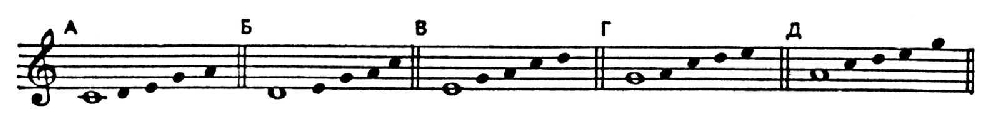 Бесполутоновая П. известна и под др. названиями: натуральная (А. С. Оголевец), чистая (X. Риман), ангемитонная, целотоновая; протодиатоника (Г. Л. Катуар), трихордная система (А. Д. Кастальский), гамма «эпохи кварты» (П. П. Сокальский), китайская гамма, шотландская гамма. Этот осн. тип П. (термин «П." без спец. добавлений обозначает обычно бесполутоновую П.) представляет собой 5-ступенную систему, все звуки к-рой могут быть расположены по чистым квинтам. Между соседними ступенями звукорядов этой П. заключены только два вида интервалов — б. секунда и м. терция. Для П. характерны бесполутоновые трёхступенные попевки — трихорды (м. терция + б. секунда, напр. е-g-а). В связи с отсутствием полутонов в П. не могут образоваться острые ладовые тяготения. Звукоряд П. не выявляет определённого тонального центра. Поэтому функции гл. тона может выполнять любой из пяти звуков; отсюда пять разл. вариантов звукоряда П. одного и того же звукового состава:
