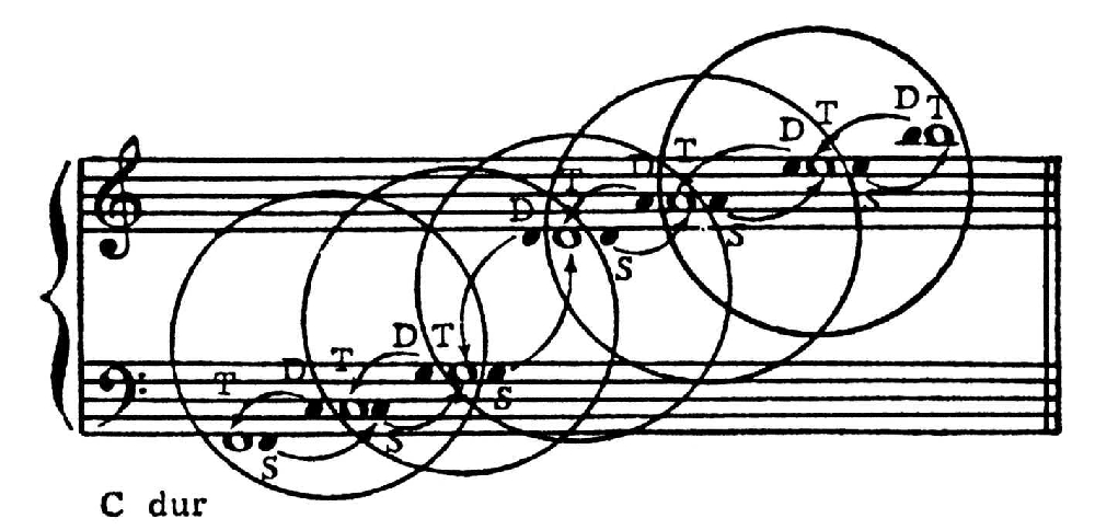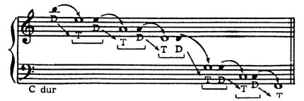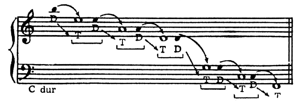 Все местные опоры (на схеме — Т) Ю. Н. Тюлин называет побочными тониками; тяготеющие к ним П. ф. (на схеме — D) — соответственно побочными доминантами, распространяя это понятие и на диатонич. аккорды. Неустойчивые П. ф. могут быть не только доминантовыми, но и субдоминантовыми. В результате все тоны диатонич. квинтового ряда образуют полные (S — T — D) ладовые ячейки, кроме краевых тонов (в C-dur f и h), т. к. уменьшенно-квинтовое соотношение лишь при нек-рых условиях уподобляется чисто-квинтовому. Полную схему основных и П. ф. см. вверху колонки 241.