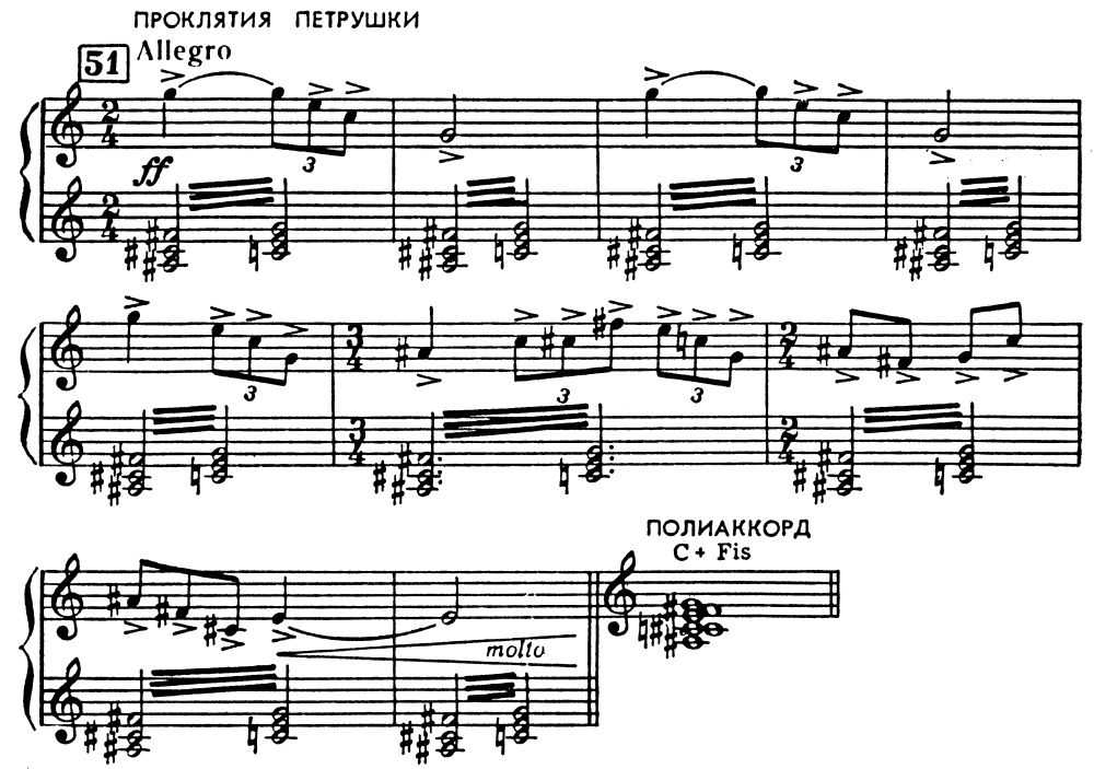 Выразит. свойства П. связаны с восприятием двух или неск. неидентичных аккордов в одновременности; при этом главное (как и в др. составных структурах) заключается не в звучании каждого из субаккордов, а в том новом качестве, к-рое возникает при их соединении (так, в нотном примере C-dur и Fis-dur — консонирующие аккорды, а целое — диссонанс; субаккорды диатоничны, П. недиатоничен; мажорность каждого из субаккордов выражает свет и радость, а П.- «проклятия» Петрушки, далее — «отчаяние» Петрушки). Термин «полиаккорд» введён Г. Коуэллом (1930).