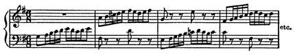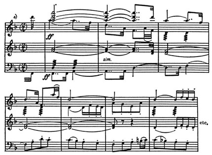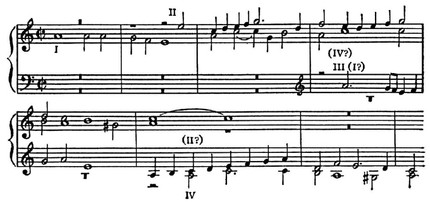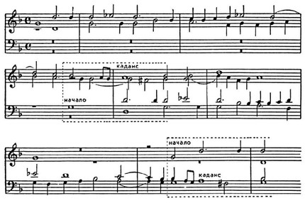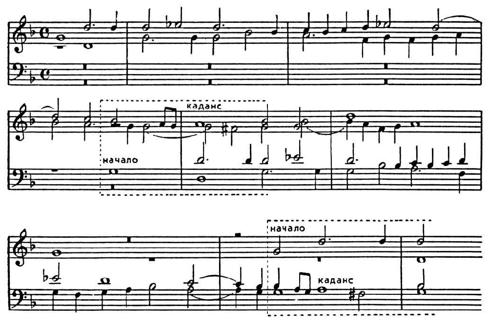 В первом случае развёртывается двухгол. канон, заглавные обороты к-рого перетекают в общие мелодич. формы безкаденционного движения, во втором — показана ясно очерченная тема, модулирующая в тональность доминанты с кадансовым завершением.
