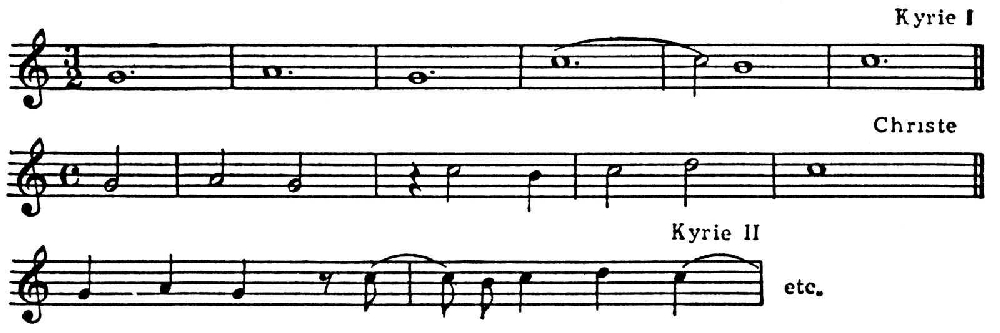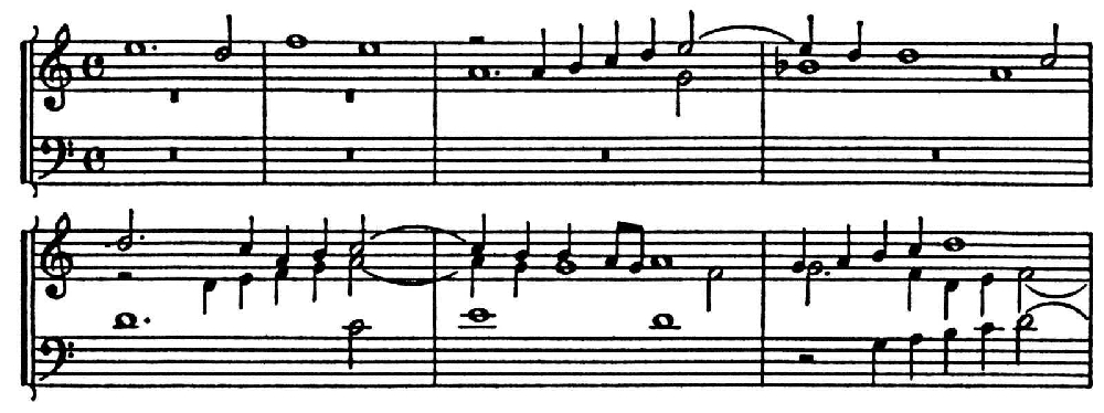 Однократные повторения, следующие сразу за своей «темой», образуют род периода из двух предложений, что очень важно с историч. точки зрения, т. к. подготовляет гомофонную форму. Такие периоды, однако, очень текучи. Ими богаты произв. Палестрины (см. пример на колонке 345), они встречаются и у Обрехта, Жоскена Депре, Лассо. Kyrie из соч. последнего «Missa ad imitationem moduli „Puisque j’ai perdu“» — это период классич. типа из двух предложений по 9 тактов.