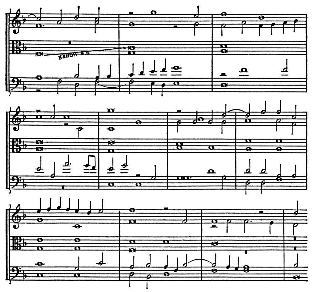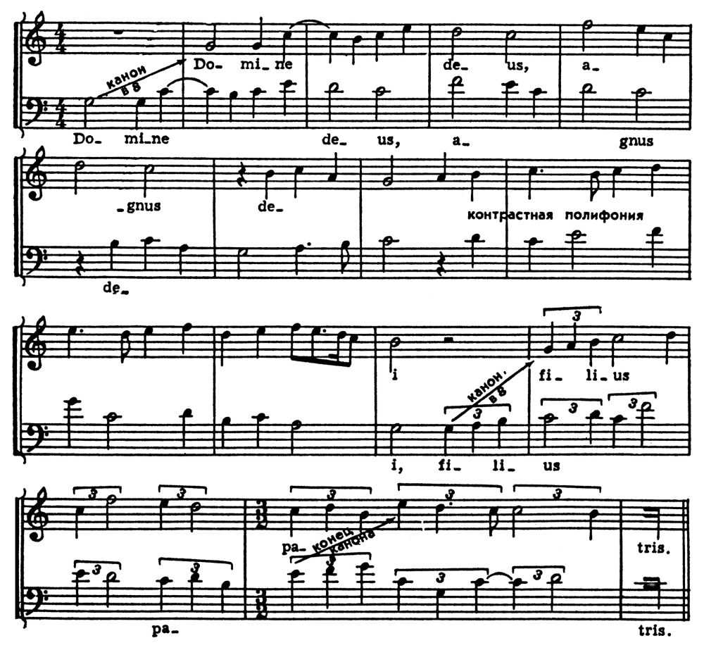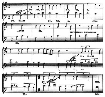 В нижнем голосе помещена хоральная мелодия «Kyrie», в среднем и верхнем — контрапункты к ней с текстами на лат. и франц. языках, мелодически близкие хоралу, но всё-таки обладающие нек-рым самостоят. интонационно-ритмич. рисунком. Форма целого — вариации — складывается на основе повторения хоральной мелодии, выступающей как cantus firmus при мелодически изменяемых верхних голосах. В мотете Г. де Машо «Trop plus est bele — Biaute paree — Je ne suis mie» (ок. 1350) каждый голос имеет свою мелодию с собств. текстом (все на франц. языке), причём нижний, с его более ровным движением, тоже представляет повторяющийся cantus firmus, и в итоге также образуется форма полифонич. вариаций. Это типич. образцы раннего мотета — жанра, несомненно сыгравшего важную роль на пути к зрелой форме П. Общепринятое разделение зрелого полифонич. иск-ва на строгий и свободный стили соответствует как теоретич., так и историч. признакам. П. строгого стиля характерна для нидерландской, итальянской и др. школ 15–16 вв. Её сменила П. свободного стиля, продолжающая развиваться и поныне. В 17 в. выдвинулась наряду с другими нем. нац. школа, в творчестве величайших полифонистов Баха и Генделя достигшая в 1-й пол. 18 в. вершин полифонич. иск-ва. Оба стиля в рамках своих эпох прошли определ. эволюцию, теснейшим образом связанную с общим развитием муз. иск-ва и присущими ему закономерностями гармонии, лада и др. муз.-выразит. средств. Границей между стилями служит рубеж 16–17 вв., когда в связи с рождением оперы ясно оформился гомофонно-гармонич. склад и утвердились два лада — мажор и минор, на к-рые стала ориентироваться вся европ. музыка, в т. ч. и полифоническая.