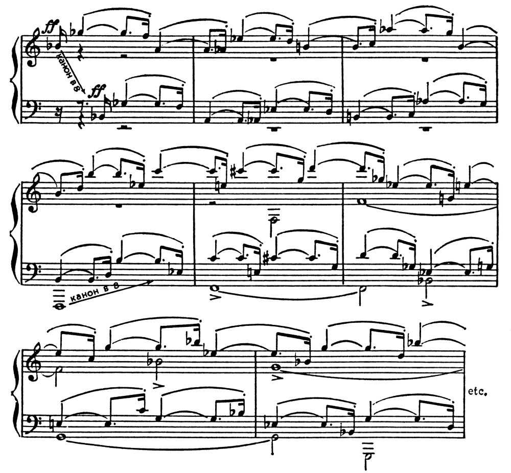 Во избежание однообразия в муз. содержании канона пропоста построена здесь так, что происходит планомерное чередование мелодико-ритмич. фигур. При проведении риспосты они отстают от фигур пропосты, и по вертикали возникает интонац. контраст, хотя по горизонтали мелодии одинаковы.