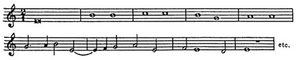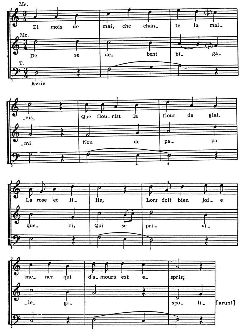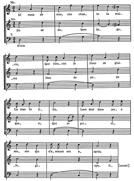 Тот же принцип использован в мессе «Malheur me bat» Обрехта. Приводим её cantus firmus вместе с опубликованным первоисточником — трёхгол. одноимённый шансон Окегема: