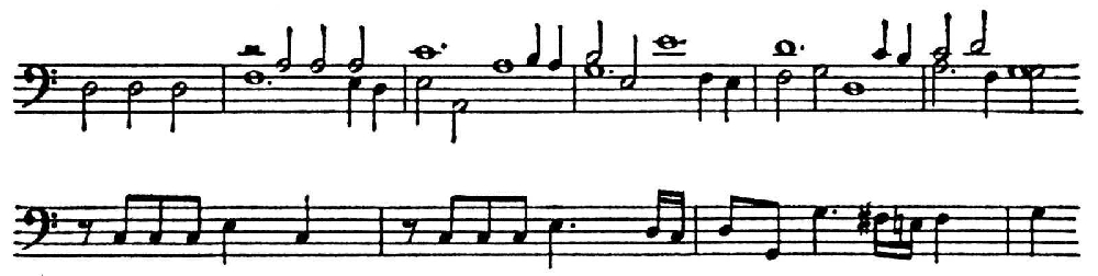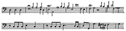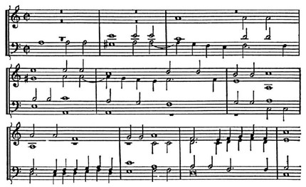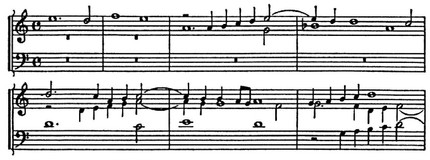 Интонационно тематизм П. свободного стиля в известной мере подготовлен строгим стилем. Таковы декламац. мелодич. обороты с повторением звука, начинающиеся со слабой доли и идущие к сильной на секунду, терцию, квинту и др. интервалы вверх, ходы на квинту от тоники, обрисовывающие ладовые устои (см. примеры), — эти и подобные им интонации в дальнейшем образовали в свободном стиле «ядро» темы, за к-рым следовало «развёртывание», основанное на общих формах мелодич. движения (гаммообразность и т. д.). Принципиальное отличие тем свободного стиля от тем строгого стиля заключается в оформлении их в самостоятельные, одноголосно звучащие и завершённые построения, сжато выражающие главнейшее содержание произв., тогда как тематизм в строгом стиле был текуч, излагался стреттно в совокупности с др. имитирующими голосами и лишь в комплексе с ними раскрывалось его содержание. Контуры темы строгого стиля терялись в непрерывном движении и вступлении голосов. В следующем ниже примере сопоставлены интонационно сходные образцы тематизма строгого и свободного стилей — из мессы «Pange lingua» Жоскена Депре и из фуги Баха на тему Дж. Легренци.