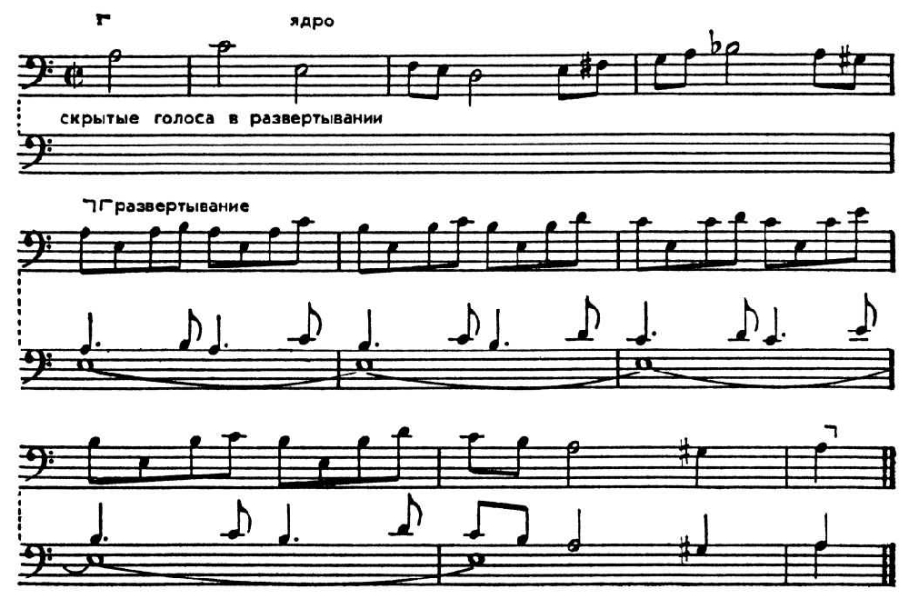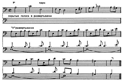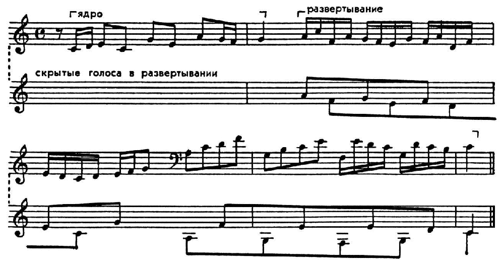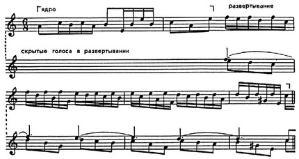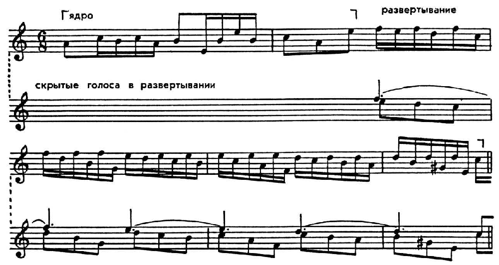 В такие моменты образуются узлы сложных структурных сплетений, совмещающие в одновременности разные функции муз. формы. Вслед за тем наступает определ. разрежение напряжённости, движение упрощается вплоть до следующего узла сложных сплетений и т. д. В подобных драматургич. условиях протекает развитие полифонич. произв., особенно если они разрешают большие художеств. задачи, отличаются глубиной содержания.