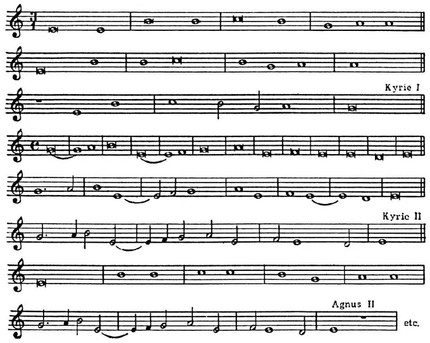 Так, напр., cantus firmus в мессе Дюфаи «La mort de Saint Gothard» последовательно переходит от долгих звуков к коротким: