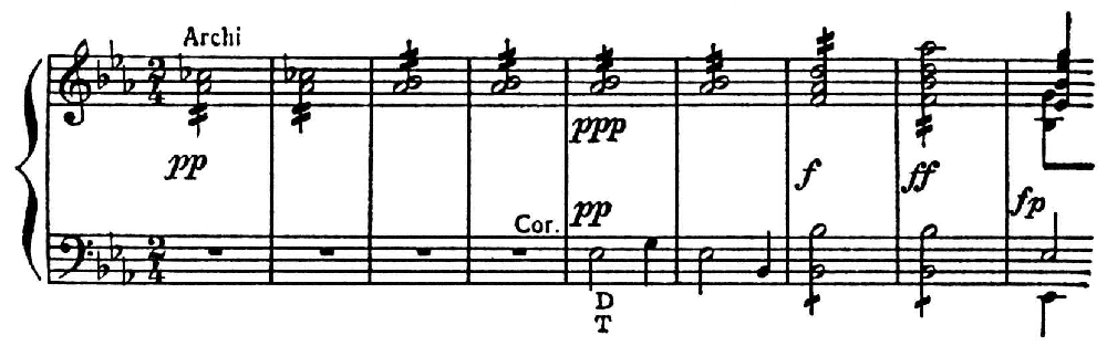 Полифункциональное противоречие D (у струнных инструментов) и T (у валторны; наподобие предъёма высшего порядка) служит предельной интенсификации стремления к ожидаемой тонике репризы и делает выразит. эффект разряда огромного тонального напряжения разработки исключительно сильным.