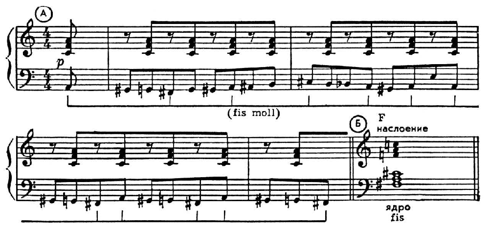Полигармония (от греч. polus — многий, обширный и гармония) — звуковысотная структура, объединяющая в одновременности в качестве своих компонентов не отдельные тоны, а целые комплексы — аккорды, созвучия, их группы. П. — частный и особый вид гармонии (к-рая предполагает объединение отд. тонов и не исключает объединения групп). Понятию П. близок полиаккорд; разница в том, что под категорию П. подходят не только собственно полиаккорды, но также и такие комплексные (составные) структуры, части к-рых могут быть не аккордами, а гармонич. единствами иного рода. Общее наименование частей П. (как полиструктуры) независимо от того, будут ли они сами по себе аккордами, группами, гармонич. полями, — субструктуры. Обычно одна из субструктур является ядром (основой) П., а её осн. тон пронизывает звучание целого (в нотном примере это — нижний слой с осн. тоном fis). Вместе с тем каждая из субструктур обладает и относит. самостоятельностью — выразительной и конструктивной.