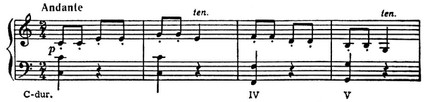 Изредка встречается и плагальная П. к. с остановкой на S (В. А. Моцарт, квартет B-dur, K.-v. 589, менуэт, такт 4); а также П. к. на побочной D (Л. Бетховен, II часть скрипичного концерта: в П. к. — побочная D на вводном тоне). Образец П. к.: