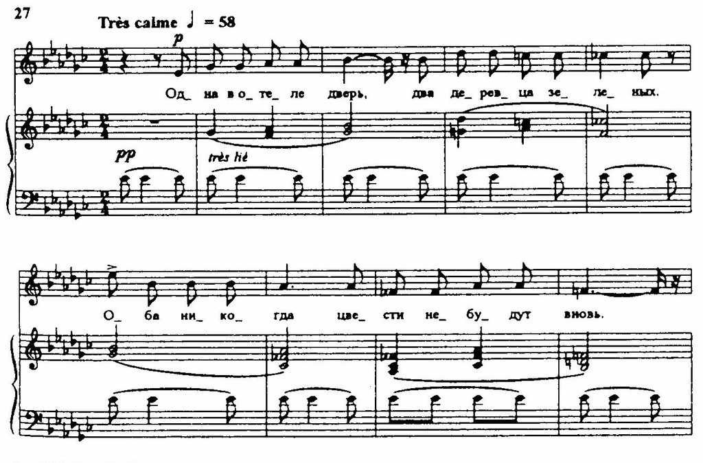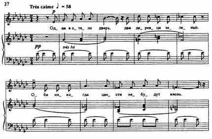 Новым смыслом наполняются создаваемые в это время вокальные сочинения на стихи Аполлинера, Элюара, Арагона. В песне «Василек» на стихи Аполлинера (1939) с горечью и болью говорится о судьбе двадцатилетнего солдата, еще не знавшего радостей жизни, но «сто раз смотревшего смерти в глаза» и обреченного на гибель. Полны тоски и нежности к Парижу, к затаившимся ныне его улицам, площадям, набережным песни «Банальности» (1940), «Монпарнас» (1943) — тоже на стихи Аполлинера (пример 27, текст приводится в переводе М. Сапонова).